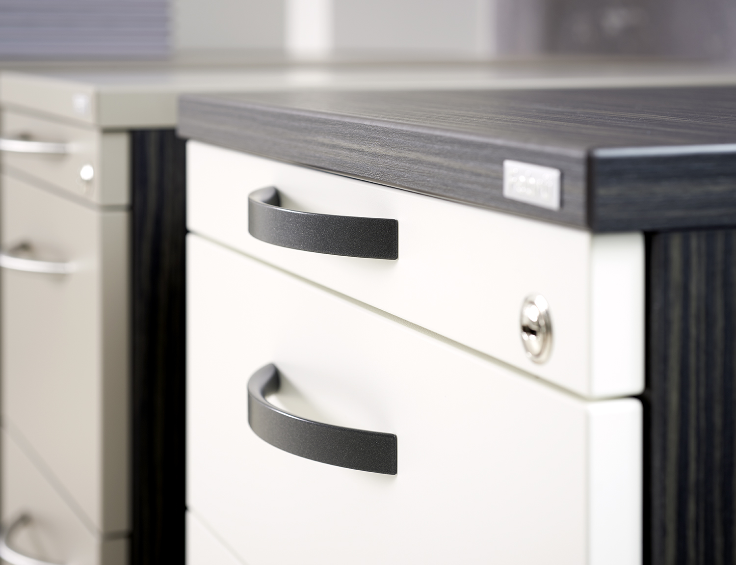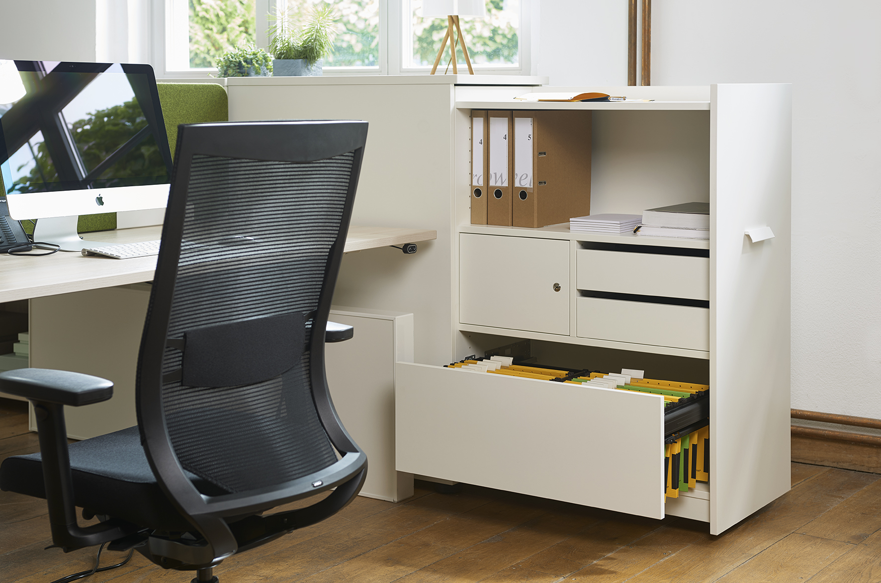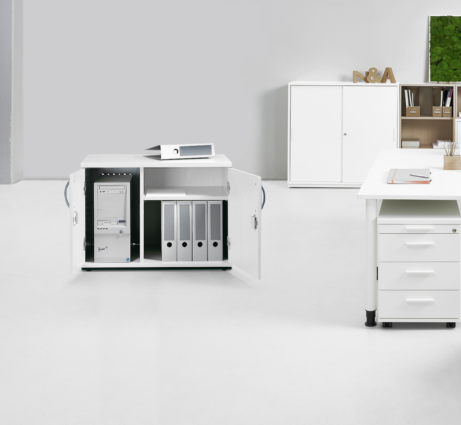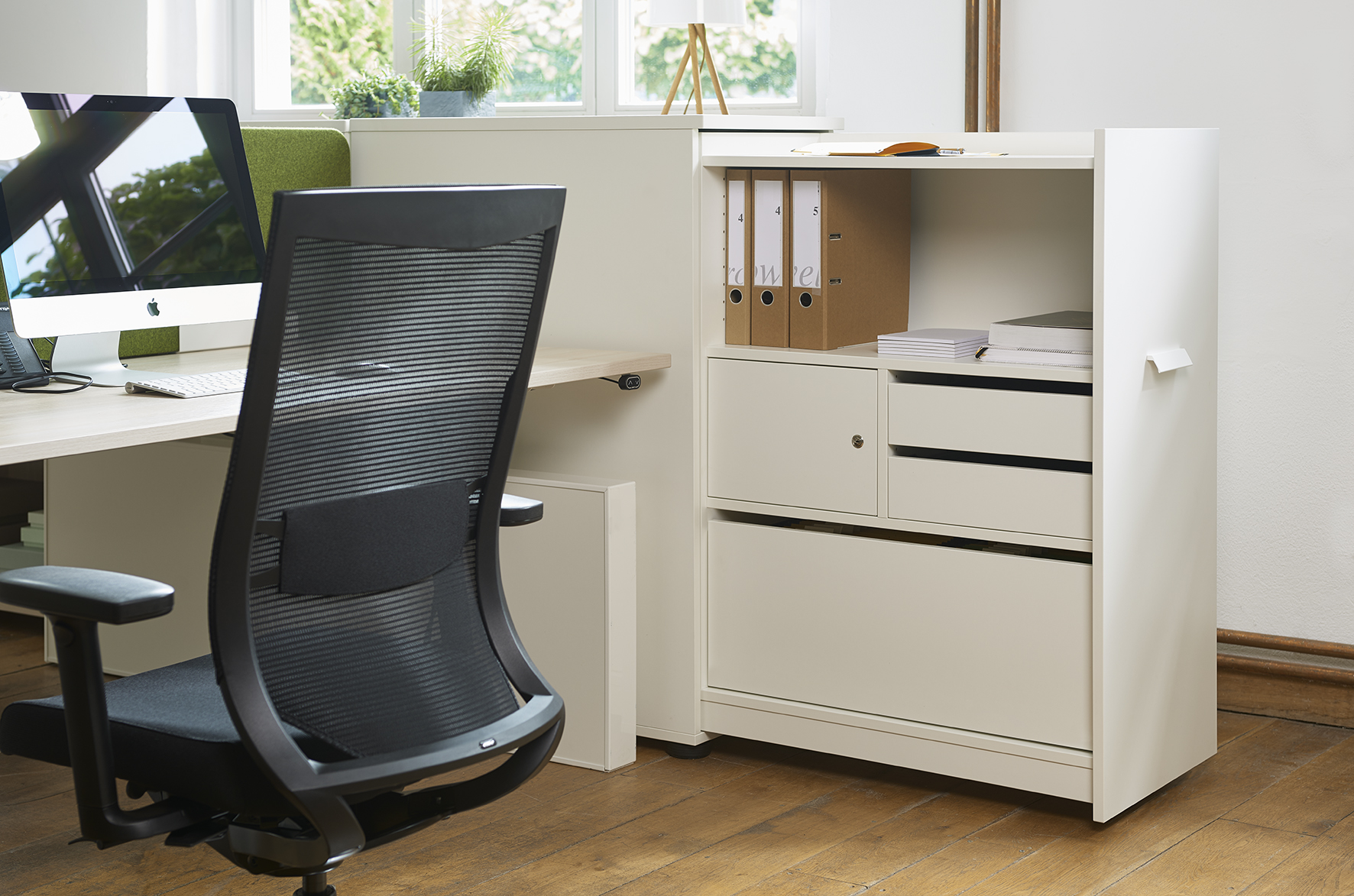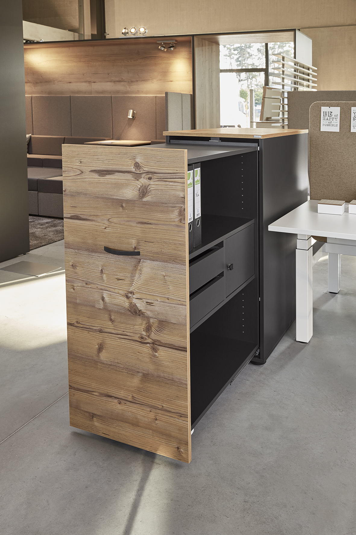 Unsere Hochcontainer bieten Sichtschutz und einen umfangreichen Stauraum, der sich nach individuellen Wünschen gestalten lässt. Schließfächer, Auszug für Hängeregister, Ordnerablagen oder Schubladen gehören zu den Einrichtungsoptionen für das praktische Büromöbel. Der Hochcontainer lässt sich durch ein leichtgängiges Rollensystem zügig schließen und ermöglicht dadurch im Handumdrehen Ordnung im Büro. Die besondere Höhe des Containers wirkt edel und ist zugleich Sichtschutz. So bietet er genügend Privatsphäre am Arbeitsplatz.