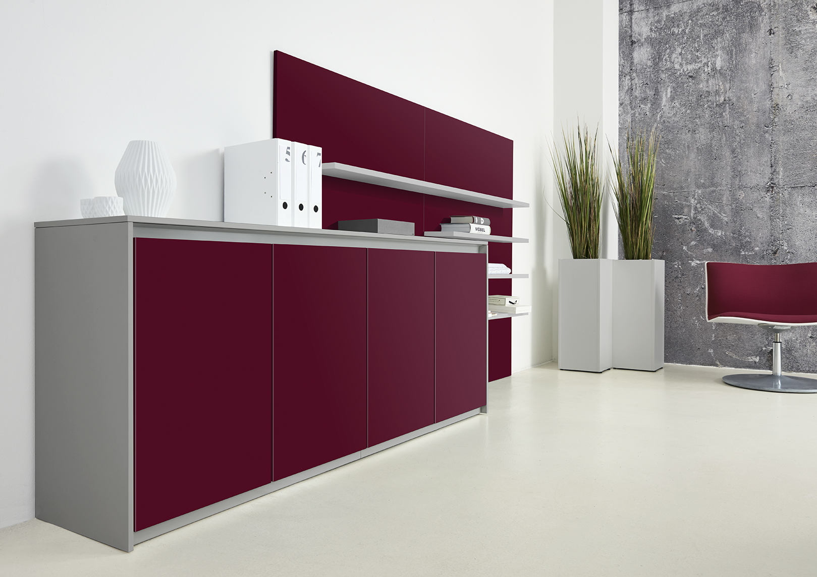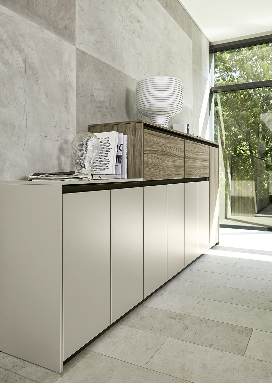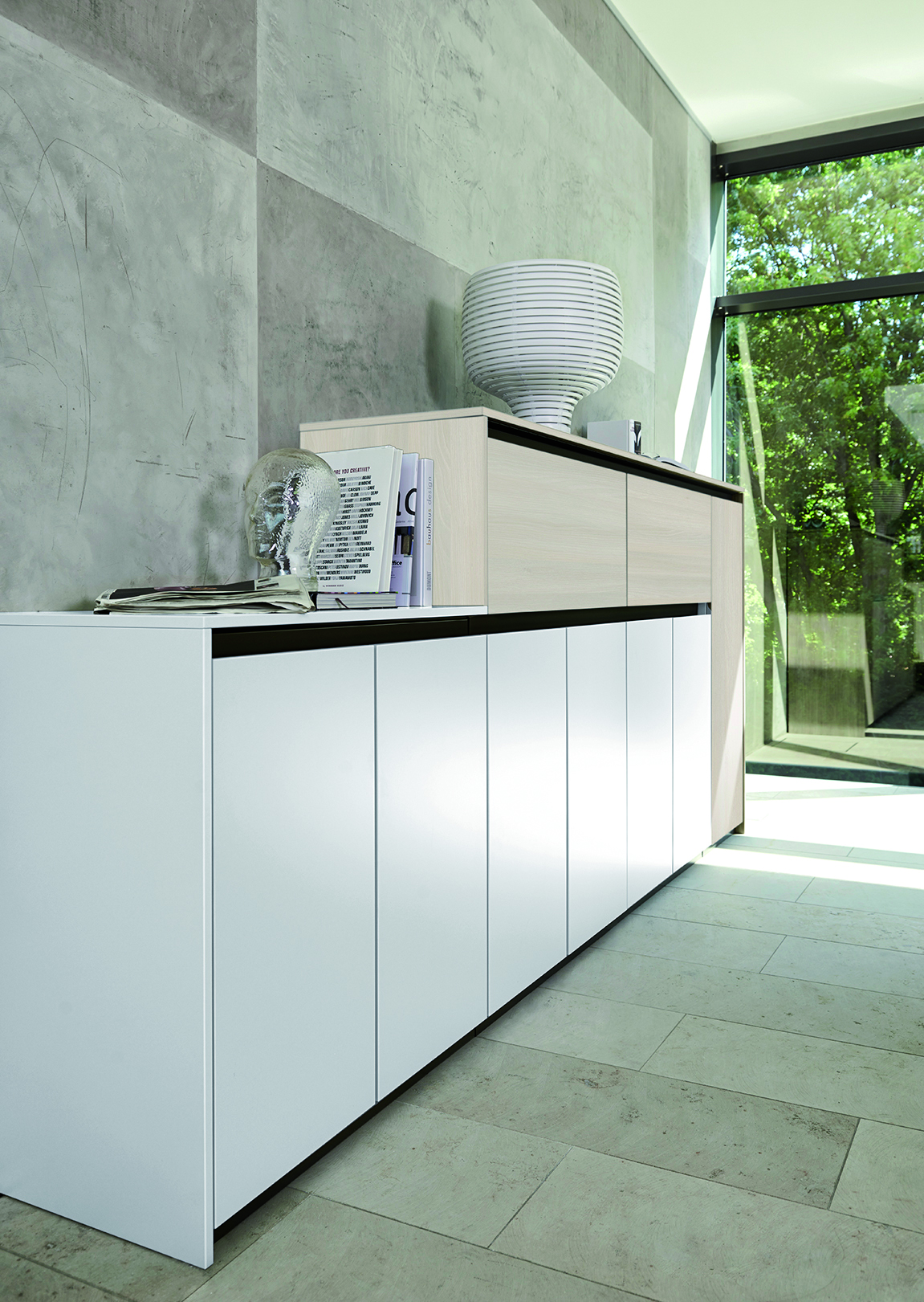 Unterschiedlichste Gestaltungsvarianten für eine moderne Möbelarchitektur sind möglich: mit waagerechtem Griffprofil als Side- oder Highboard, mit Griffprofil und Abdeckplatte als Schrankkombination bestehend aus Grund- und Aufsatzschränken, mit zwischenliegendem Griffprofil oder als flaches, dekoratives Wandboard mit griffloser Ästhetik. Zudem gibt es Regalelemente. Alternativ bieten wir auch eine Variante mit senkrechtem Griffprofil. Im Fokus steht das grifflose Design, der ästhetische Ausdruck und die sinnvolle Kombination der Purline Möbel.