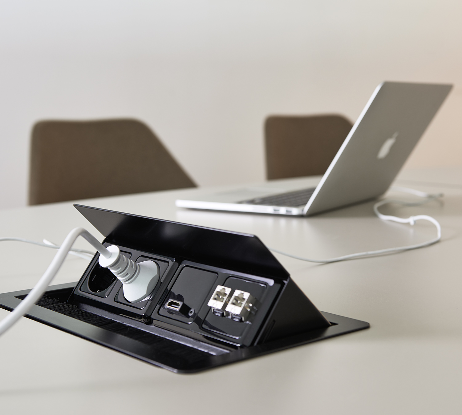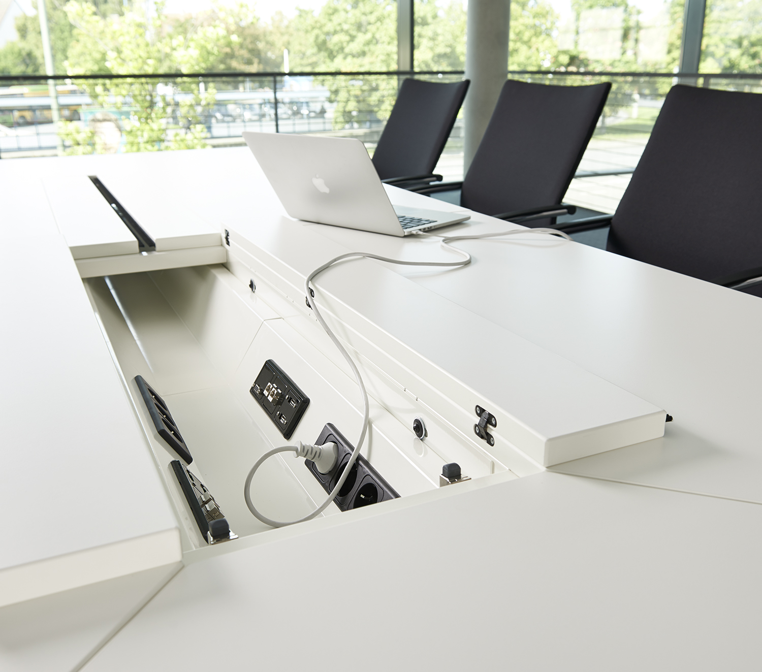 Mit dem Adesso lässt sich genau diese Anforderung passgenau umsetzten. Er ist in vielen Größen und Formen, rund oder eckig, groß oder klein verfügbar. Auch außergewöhnliche Tischformen lassen sich mit dem Adesso realisieren. Dazu kann ebenfalls eine Anschlusstechnik integriert werden, um auch bei Konferenzen mit Strom und dem Filmennetzwerk verbunden zu sein.