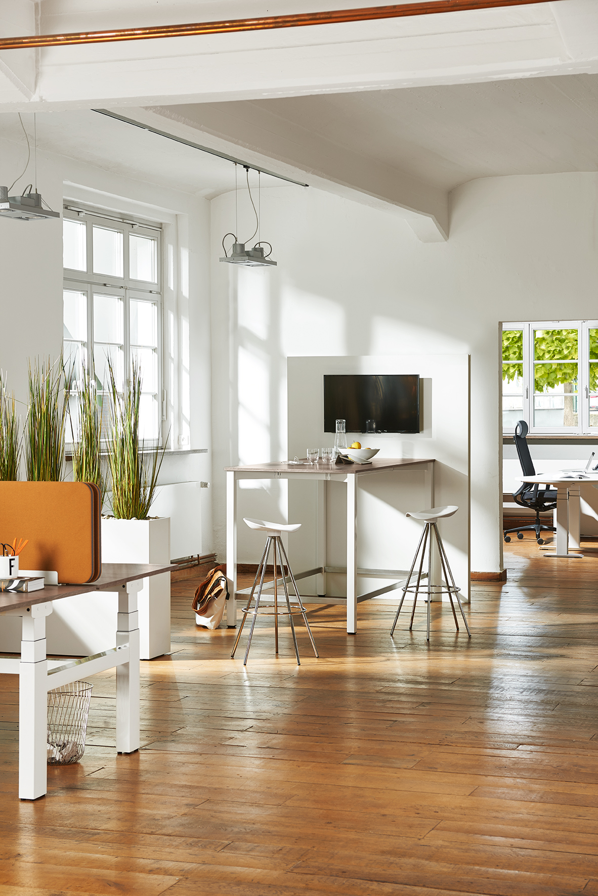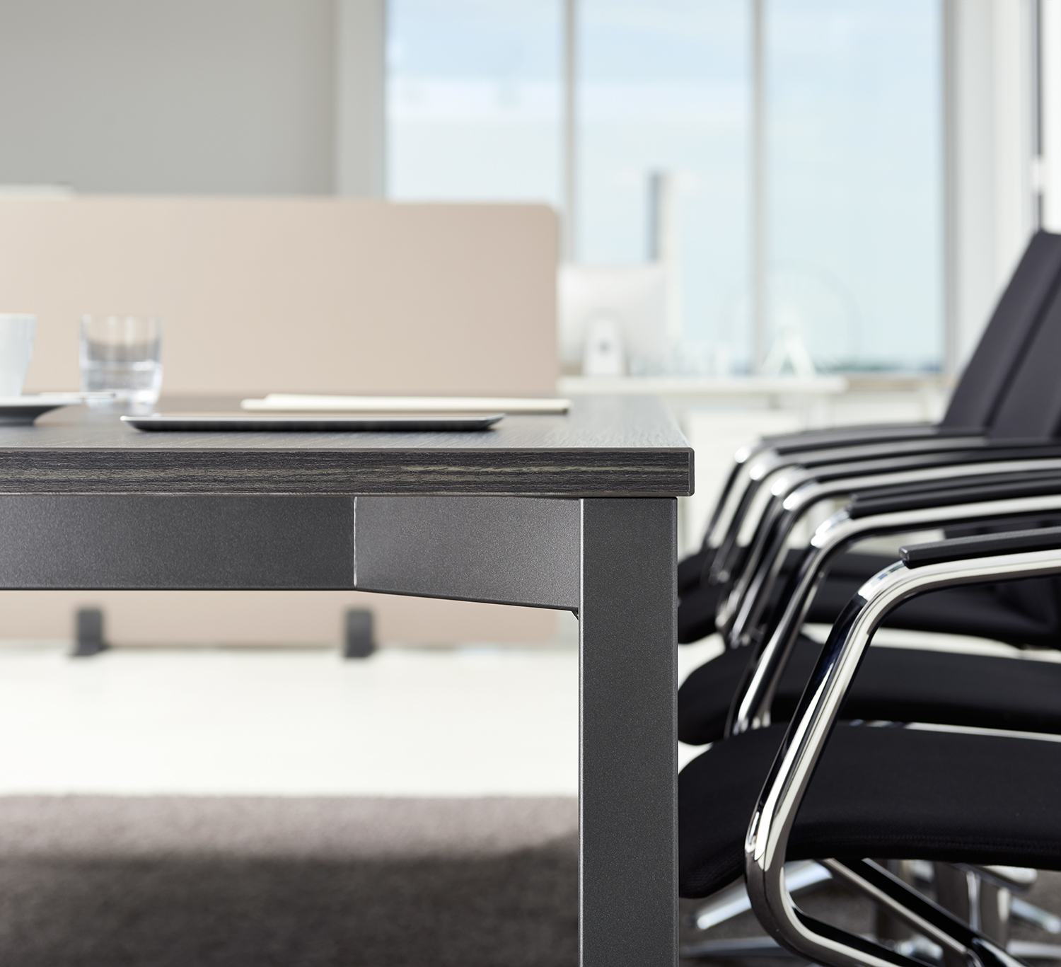 Cube mit zentralem Säulenkorpus ist elektromotorisch stufenlos von 750 bis 1.248 mm höhenverstellbar. Unser moderner Besprechungstisch eignet sich dadurch für Besprechungen im Stehen und Sitzen. Das bringt Bewegung in langes Dauersitzen und unterstützt die Sitz-Steh-Dynamik auch am Konferenztisch. Die Technik und das Bedienelement sind so integriert, dass sie nur zu erahnen sind und die repräsentative Optik der Konferenztische nicht stört.