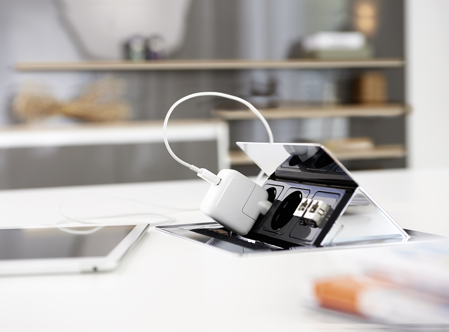 ComBoxen mit Strom- und Kommunikationseinsätzen lassen sich flächenbündig in die Tischplatte integrieren und halten so unterschiedliche Kommunikationsanschlüsse wie USB-, Strom- oder Netzwerkanschlüsse direkt am Tisch bereit.