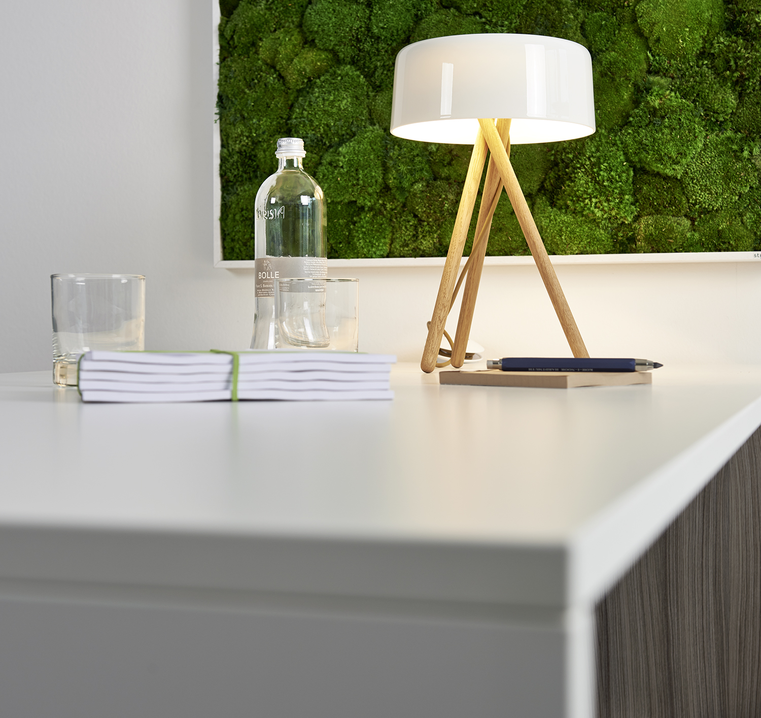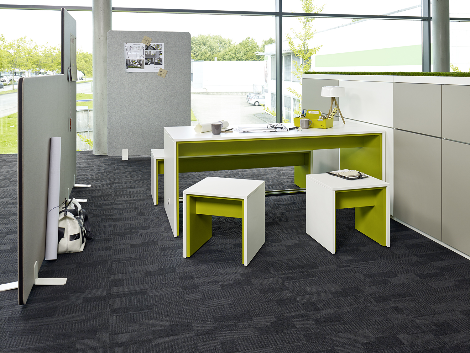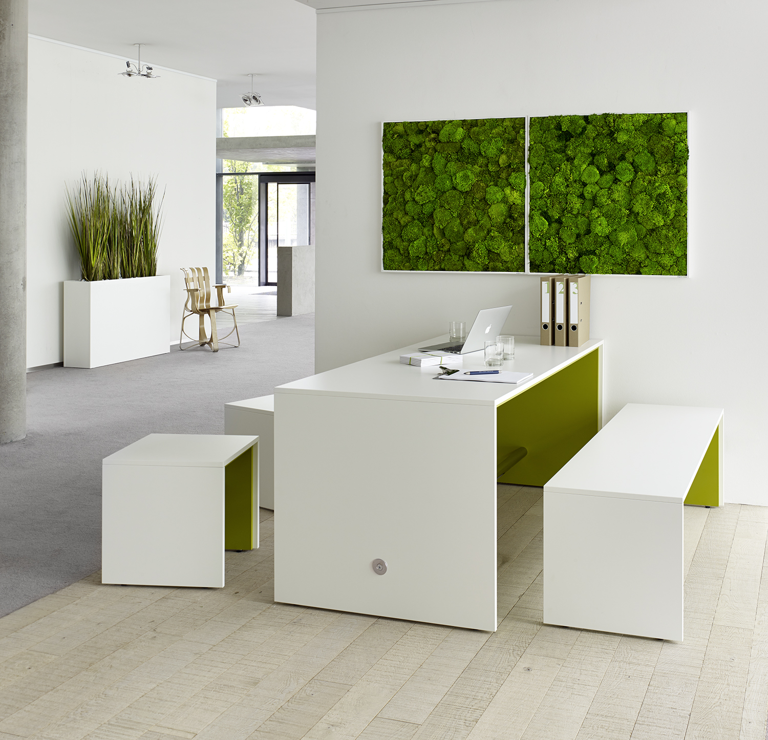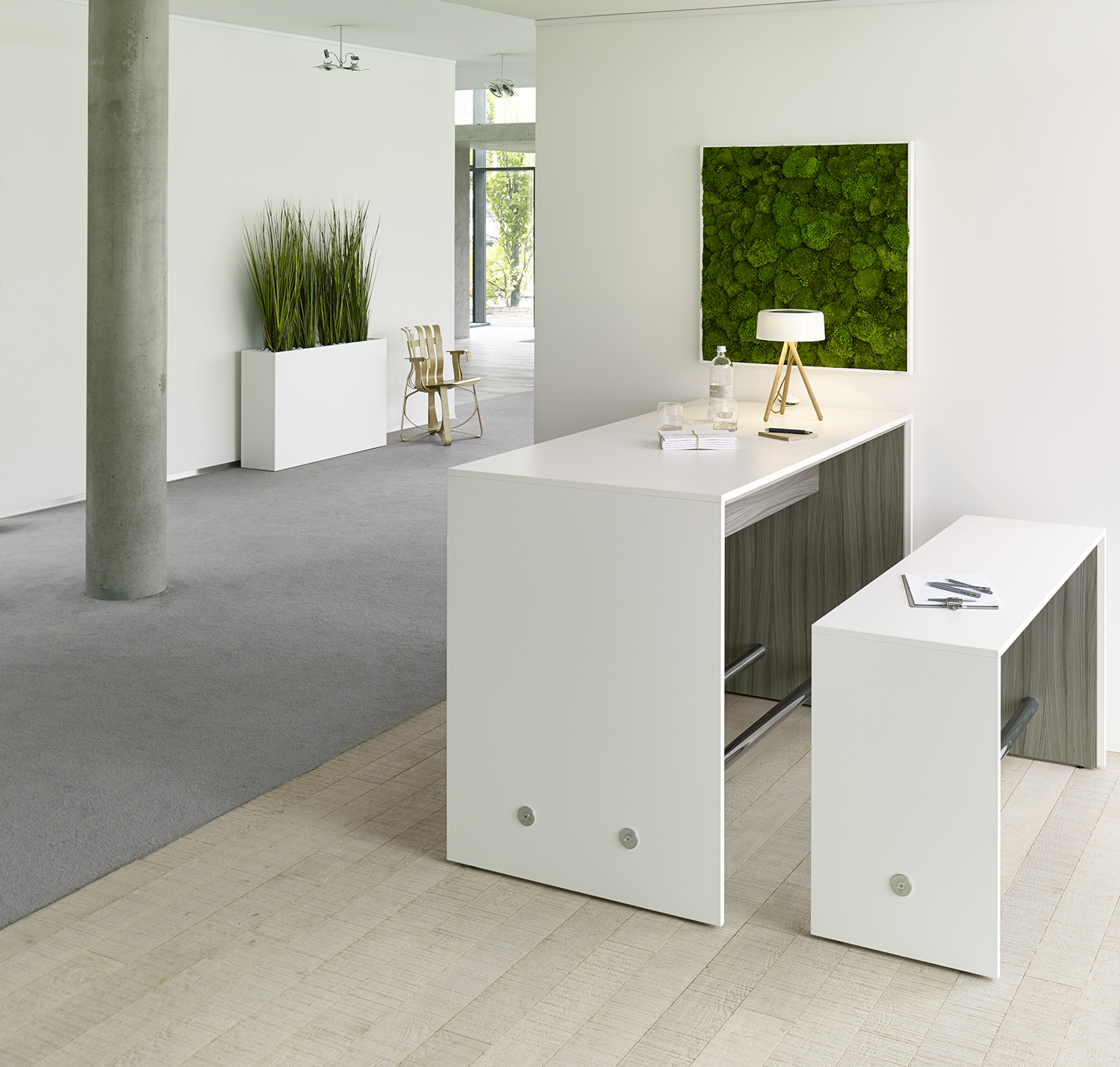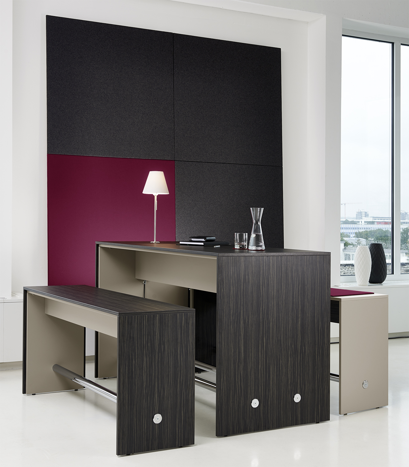 Den Tisch und die dazu passenden Bänke gibt es in einer hohen und einer niedrigen Version. Eine für den Tisch passende, fest montierte Leuchte setzt einen zusätzlichen Akzent und sorgt für Behaglichkeit und eine Wohnzimmeratmosphäre. Als zusätzliche Möglichkeit kann eine ComBox eingebaut werden, dadurch wird vorübergehendes arbeiten ermöglicht.