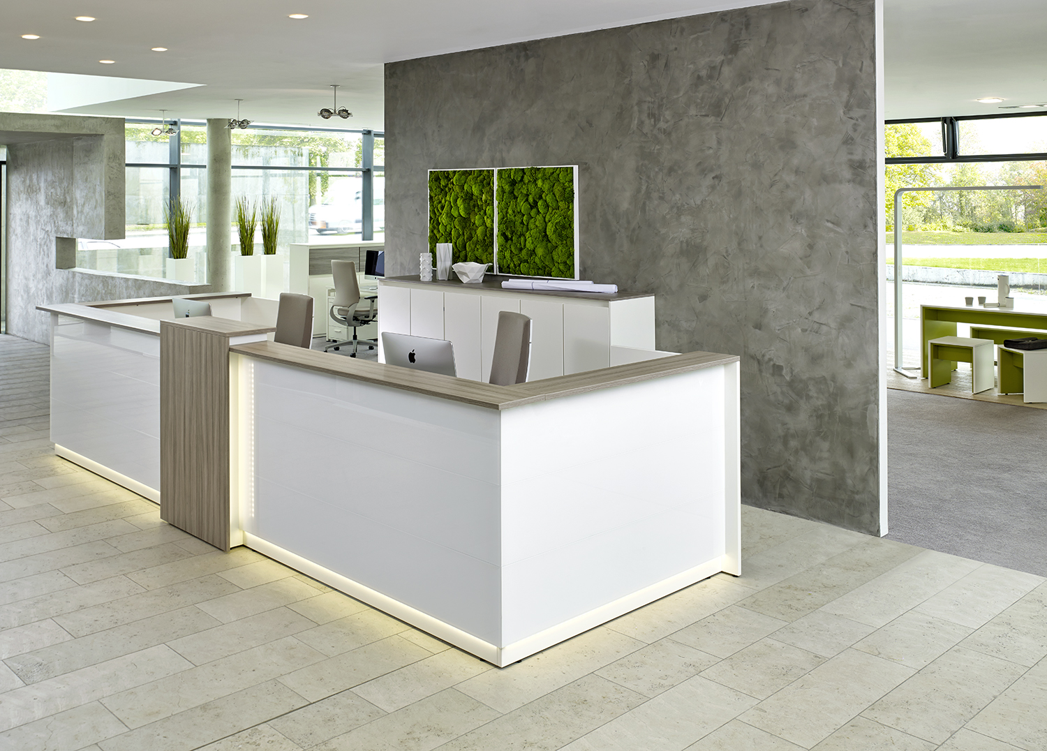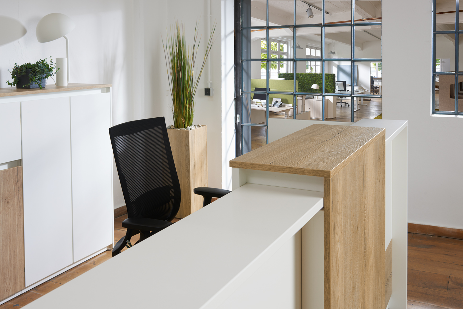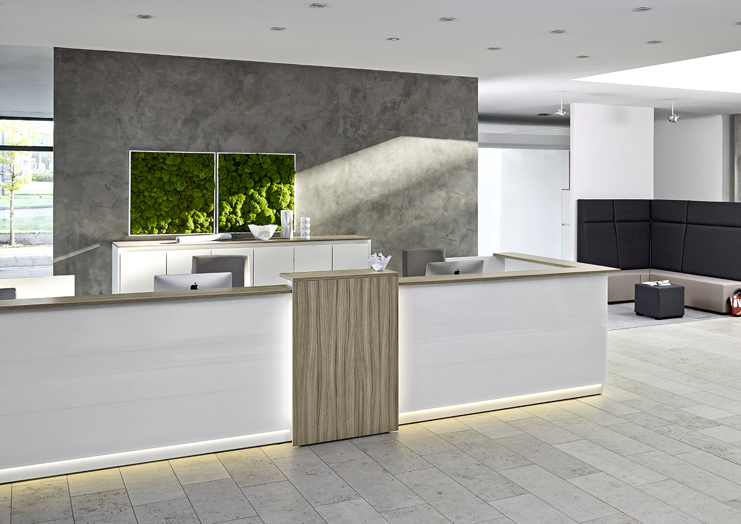 Als Schnittstellen zu Kunden und Gästen spielen Empfangstheken eine zentrale Rolle. Sie spiegeln Corporate Identity und Unternehmenskultur wider und sind dabei zugleich Arbeitsplatz. Die Empfangstheke Vio von Febrü verbindet eine einladende Optik mit der Funktionalität eines modernen Büroarbeitsplatzes.