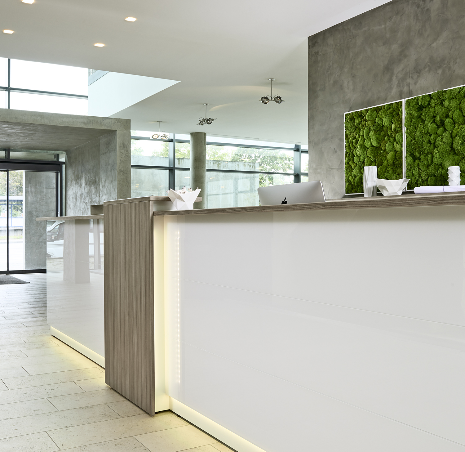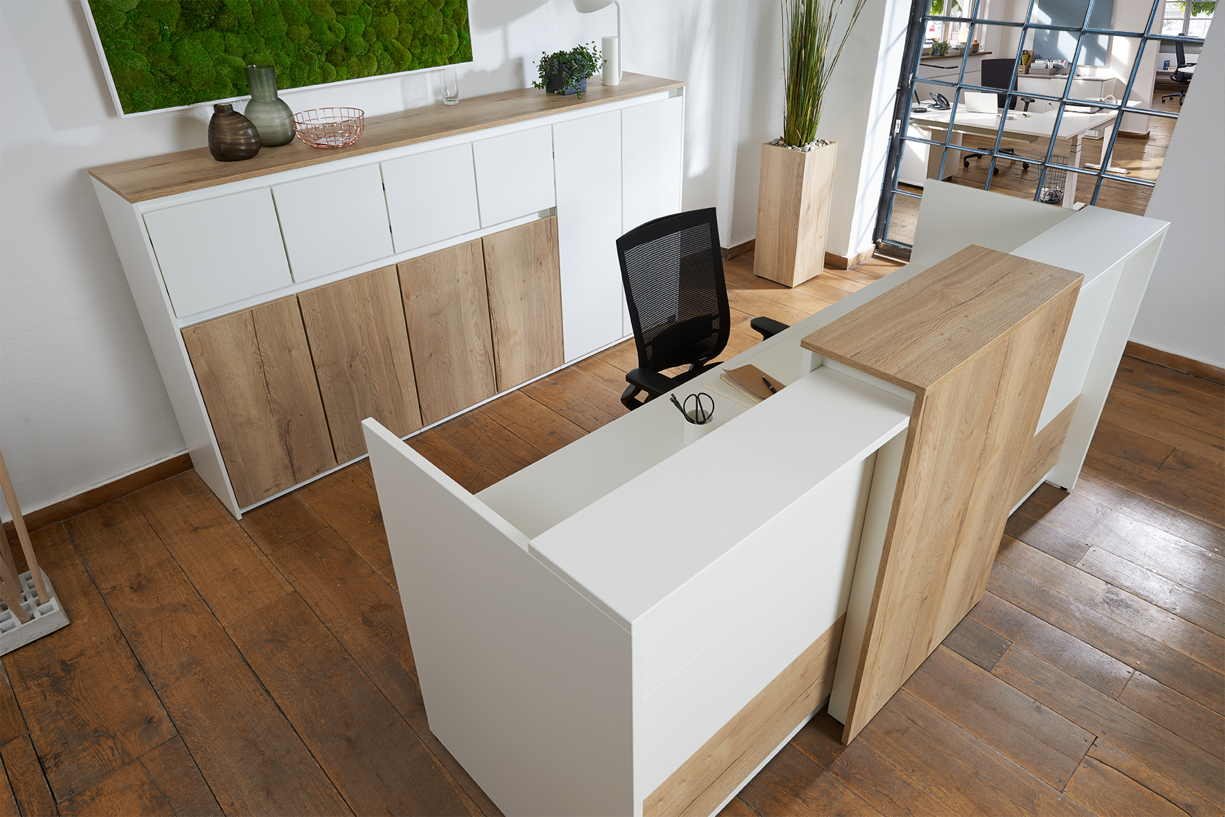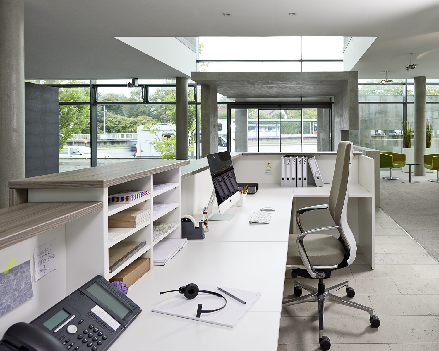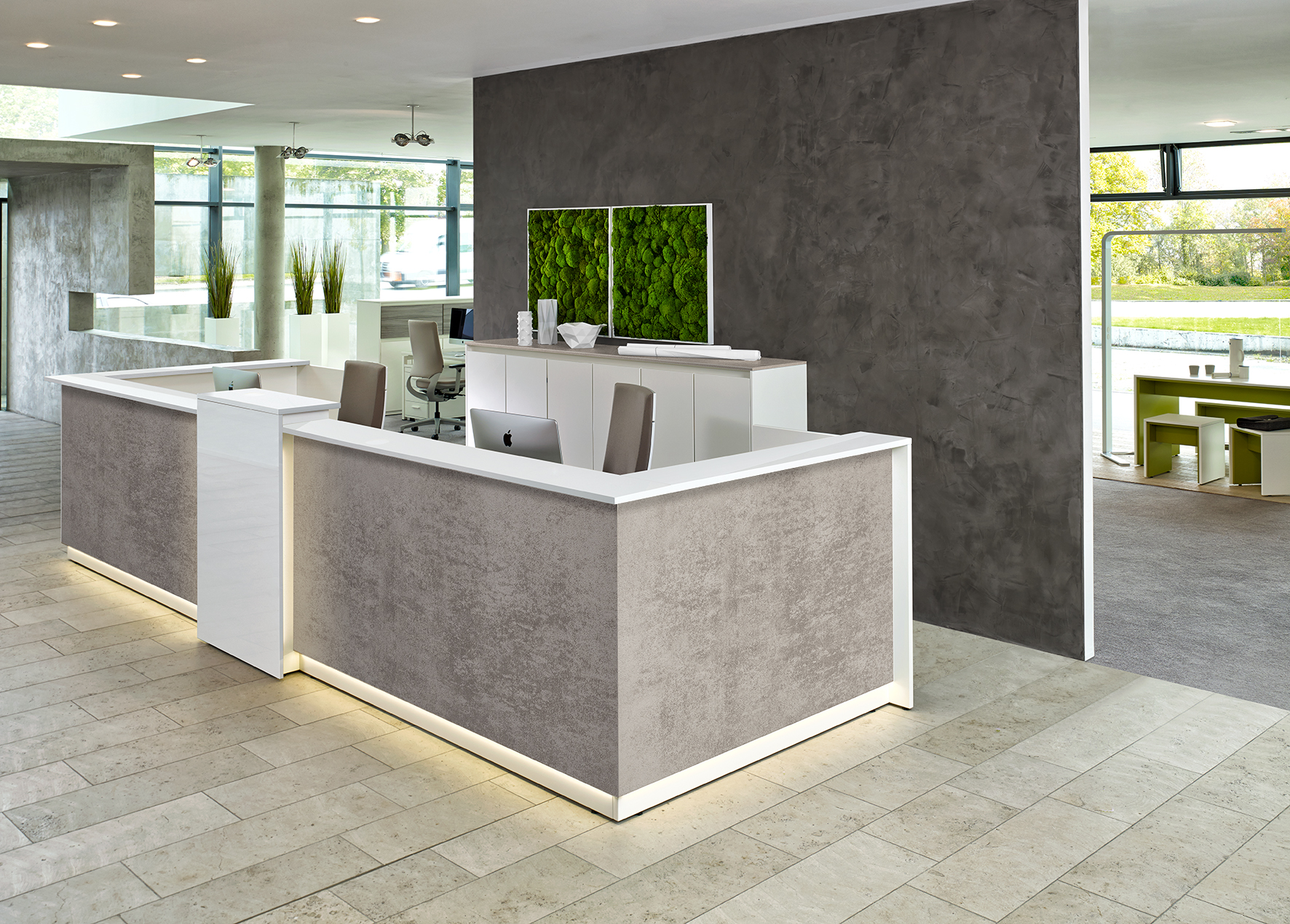 Als Schnittstellen zu Kunden und Gästen spielen Empfangstheken eine zentrale Rolle. Sie spiegeln Corporate Identity und Unternehmenskultur wider und sind dabei zugleich Arbeitsplatz. Die Empfangstheke Vio von Febrü verbindet eine einladende Optik mit der Funktionalität eines modernen Büroarbeitsplatzes.