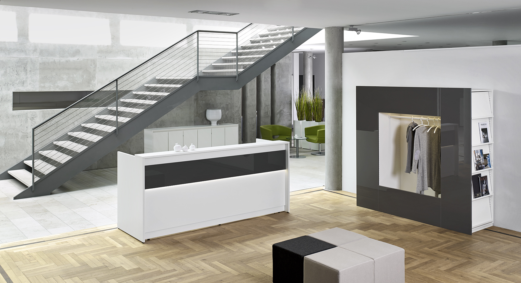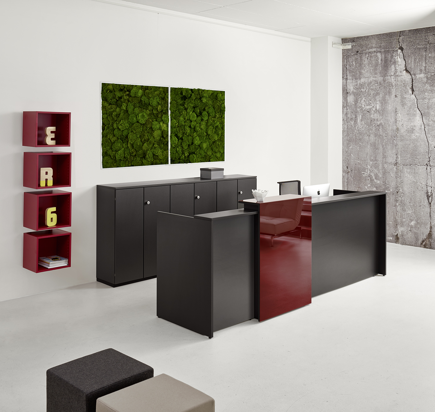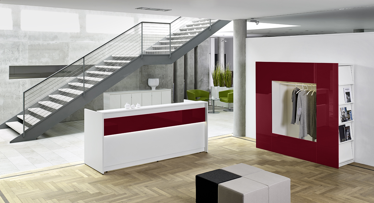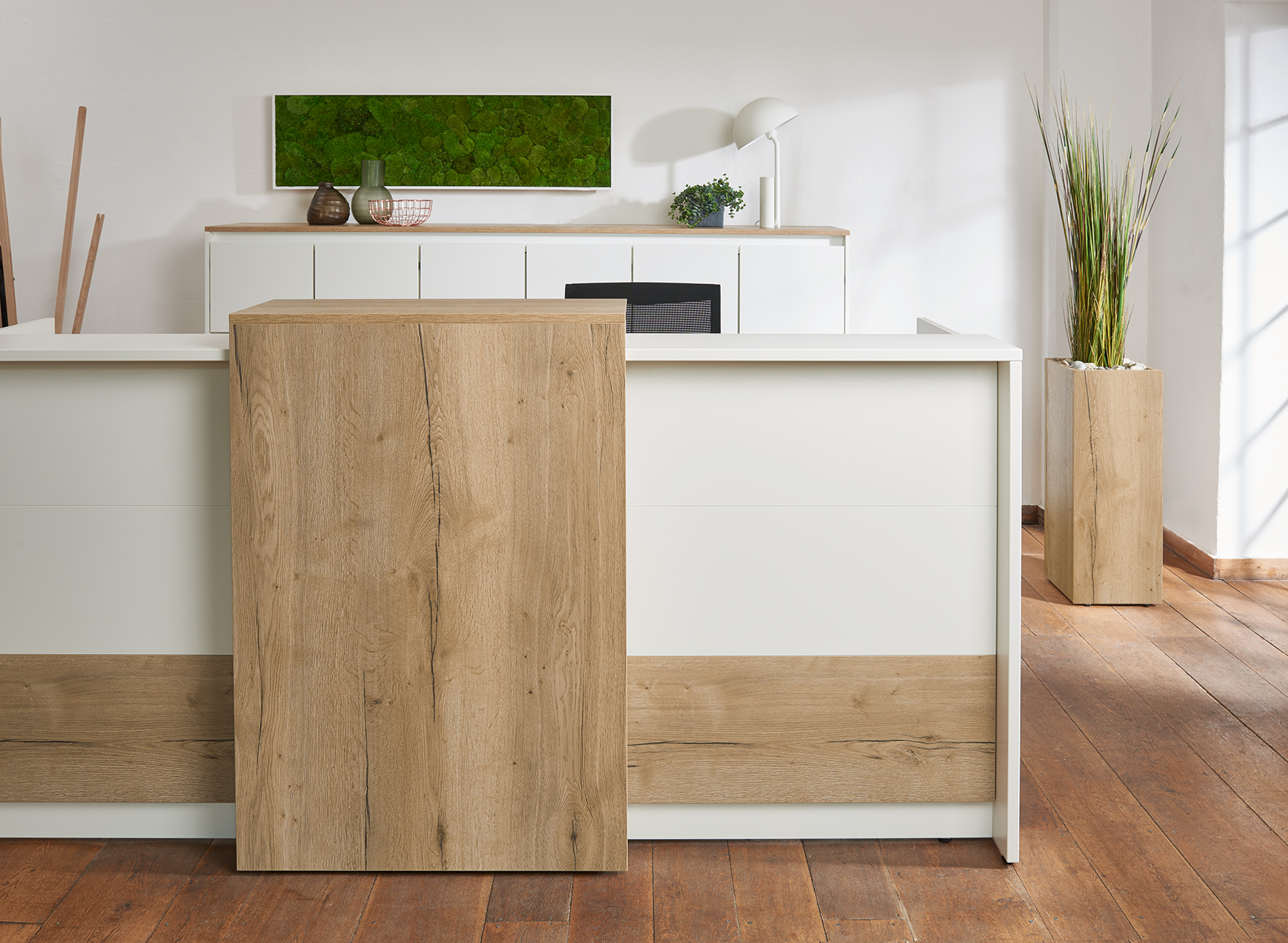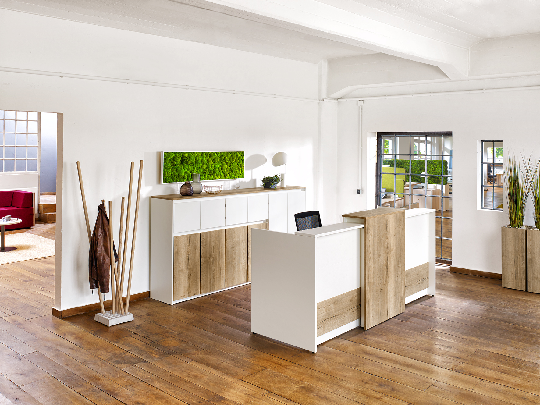 Die Empfangstheke Vio lässt in Foyers von Firmen, Büros, Praxen und Kanzleien viel Raum für die individuelle Note. Die geradlinige Form ist Basis für variantenreiche Kombinationen, mit denen sich der vorhandene Platz repräsentativ und funktional einrichten lässt. Die Grundelemente Wange, Front und Thekenplatte lassen sich sowohl als Anbau- als auch als Winkelelemente planen und können mit einem Kommunikationselement kombiniert werden.