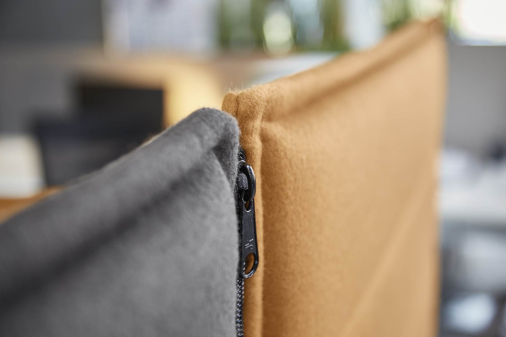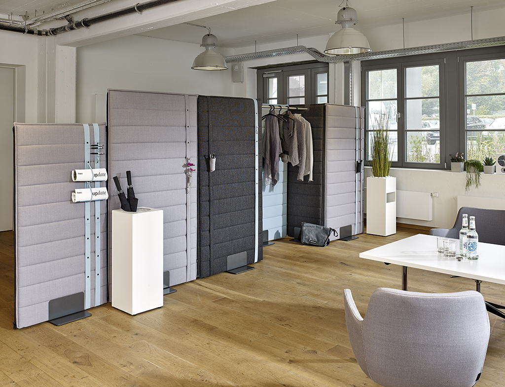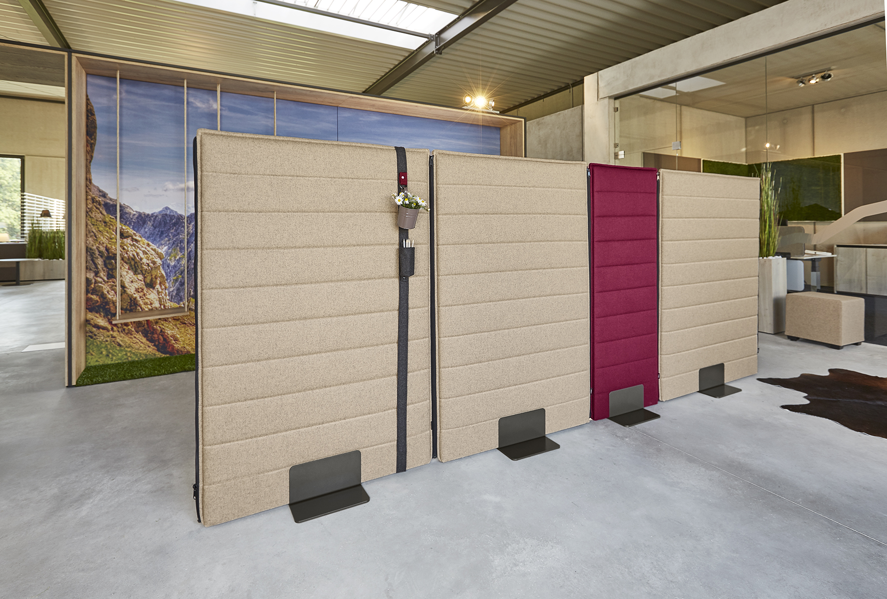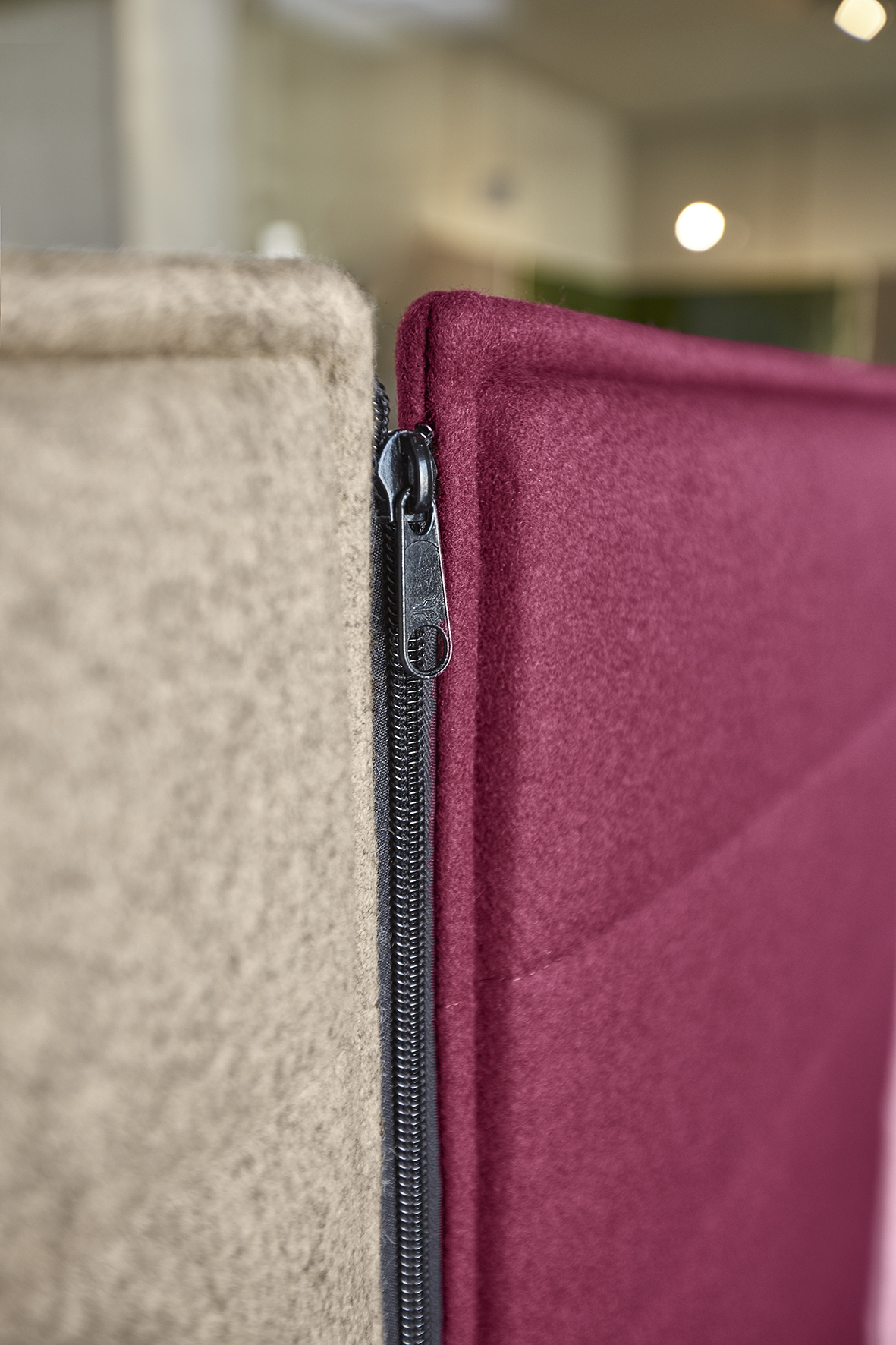 Mitten im Raum, zwischen zwei Arbeitsplätzen, direkt an einem Arbeitsplatz, im Eingangsbereich – kurz überall dort, wo Ruhe und eine optische Abschirmung erwünscht sind, zeigt sich das neue Trennwandsystem wandlungsfähig. Harmonisch abgestimmte Stoffe und Farben bieten gestalterische Spielräume. Die in fünf verschiedenen Höhen und vier Breiten erhältlichen Silent-Wandelemente lassen sich schnell und einfach konfigurieren. Dazu werden die einzelnen Elemente mit Reißverschlüssen verbunden. Ein zu den weich gepolsterten Paneelen kontrastierender Metallfuß bringt die nötige Standfestigkeit. Tischaufsatz- und Tischansatzelemente komplettieren Silent und ermöglichen multiple Anwendungen.