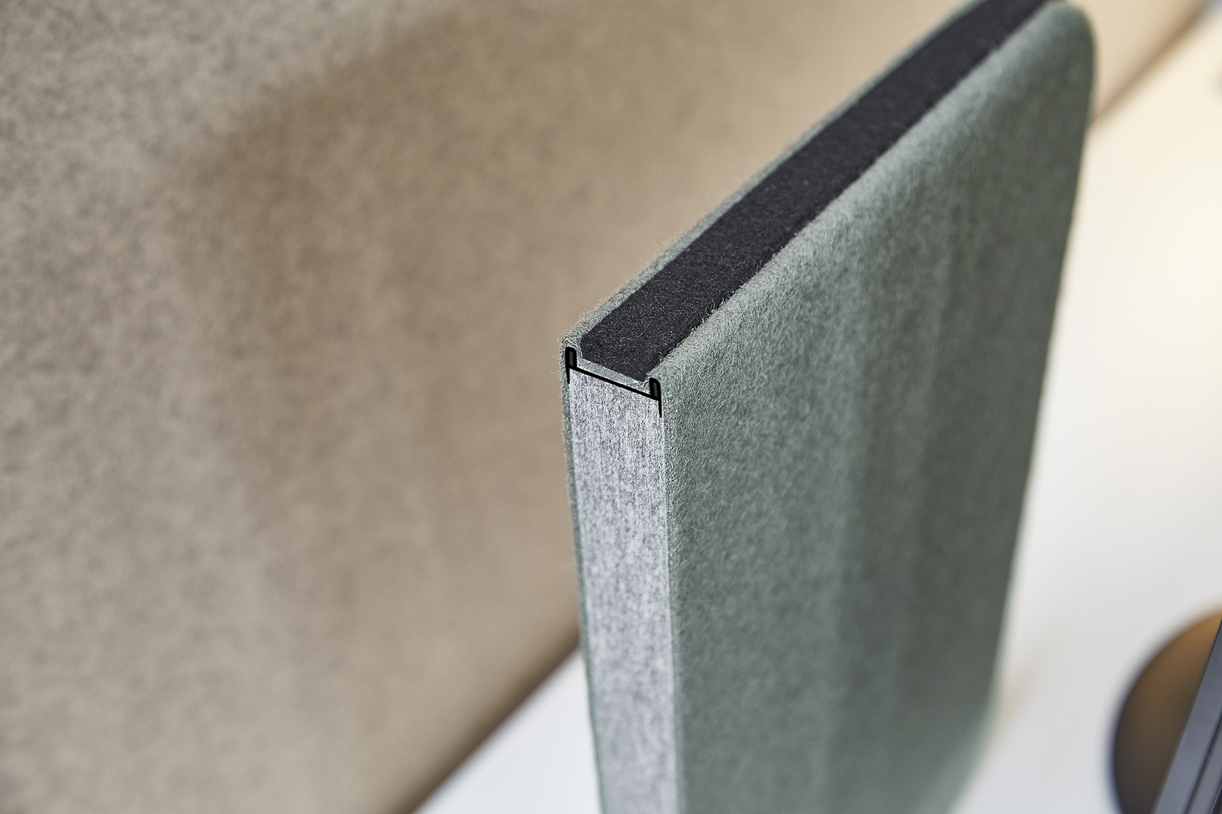 Als gestalterisches Merkmal von Screen fallen die komplett stoffbezogenen Flächen aus reiner Schurwolle mit Filz-Charakter auf. Der umlaufende Filz-Keder in unterschiedlichen Farben setzt Akzente.