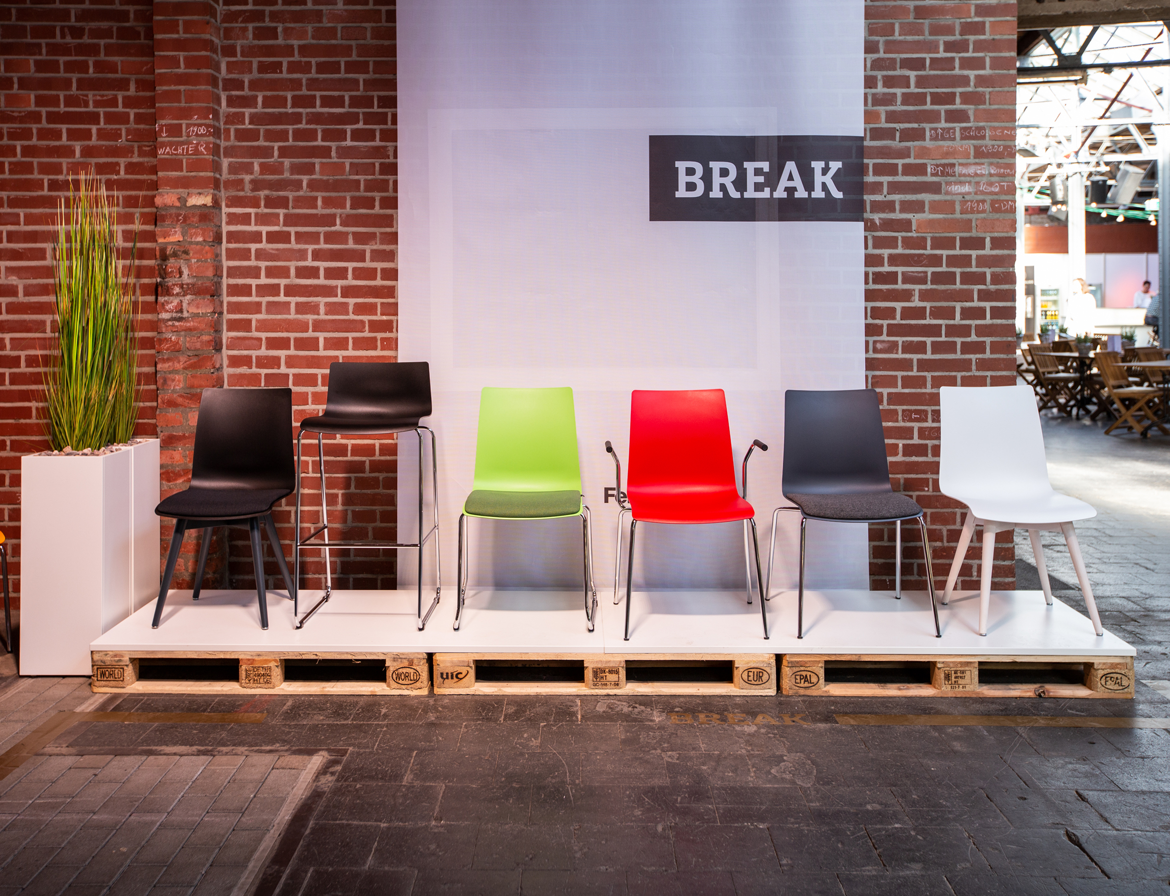 An der Stelle kommt Break ins Spiel. Puristisch, praktisch, teilweise stapelbar und farbenfroh. Dazu unterschiedliche Gestellvarianten in Stahl, als Pausenstuhl oder Barhocker. Oder mit formschönem Holzgestell. Für mehr Sitzkomfort sorgt eine stoffbezogene Sitzauflage. Und wenn die Runde plötzlich größer wird: Dank Stapelbarkeit kann Break problemlos gelagert werden.
