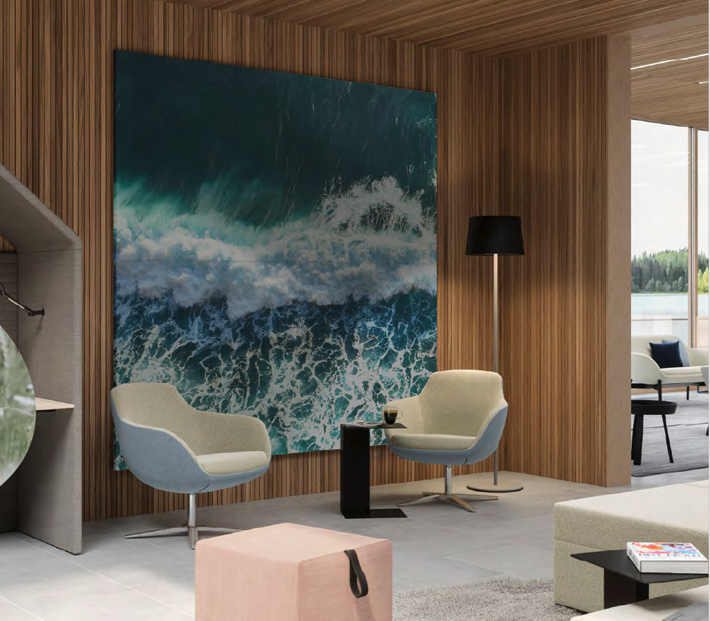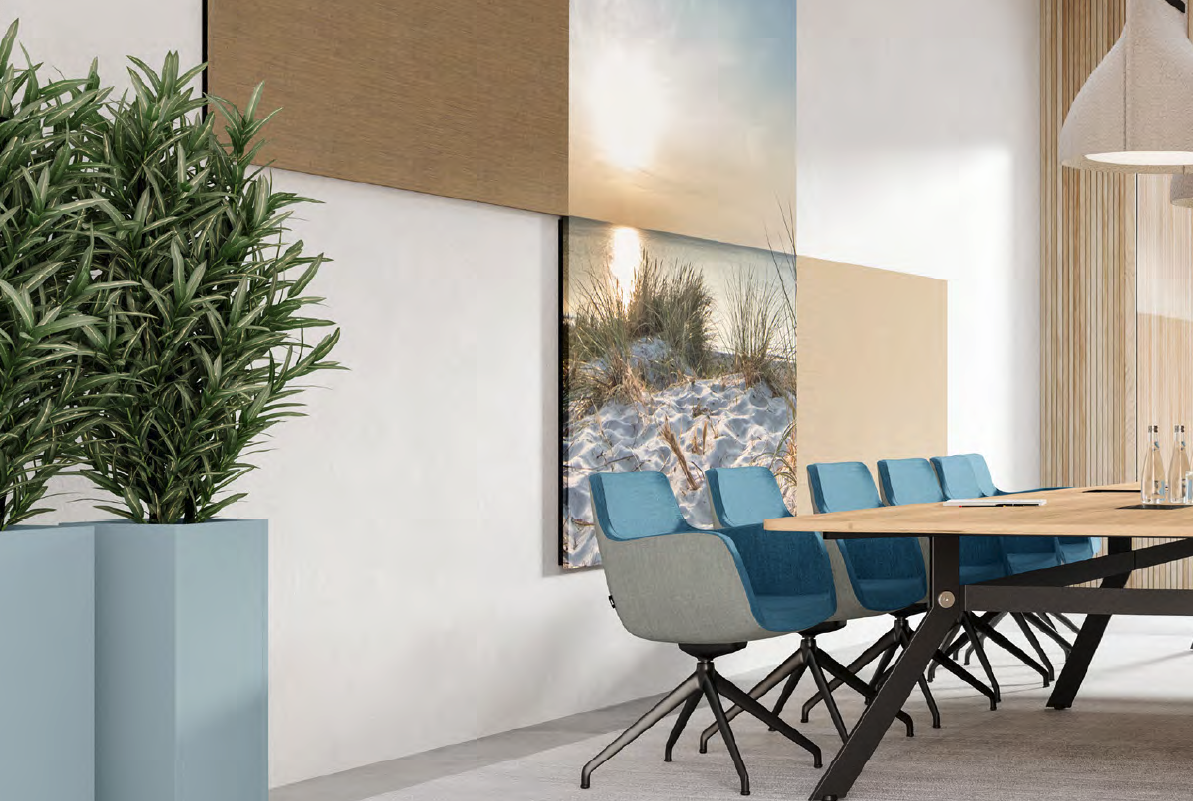 Mit "Fashion print" kann jedes Design auf Stoff aufgebracht werden. Somit können nicht nur Wände gestaltet werden, gleichzeitig tragen die gedruckten Wandpaneele zur Optimierung der Akustik in Räumen bei. Eine Landkarte oder ein trendiger Look, ein Stadtplan, spannende Texturen inklusive Logo im Empfangsbereich bis hin zu wolkigem Winterhimmel oder dem farbenfrohen Herbstwald sind nur ein Auszug aus realisierbaren Themenwelten, die eine loungige Arbeitsatmosphäre erzeugen. Außerdem lässt sich unsere Empfangstheke Vio ebenfalls mit gedruckten Stoffmotiven beziehen und bietet damit eine weitere Individualisierungsmöglichkeit.