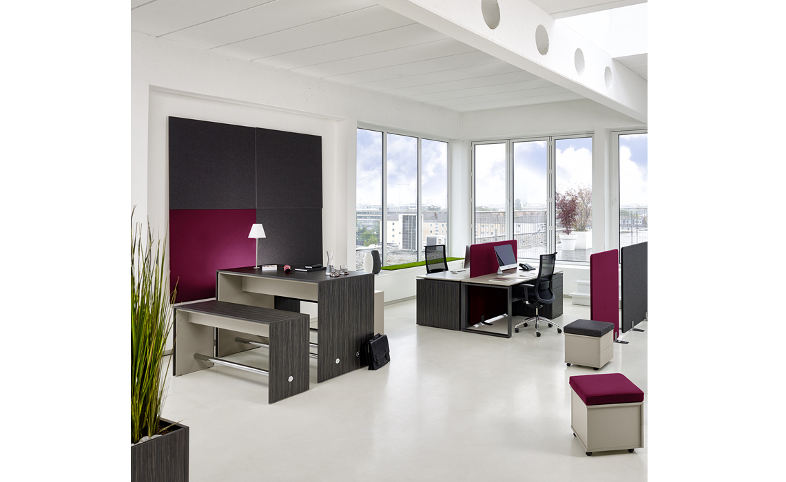 Moderne Architektur, die mit akustisch harten Materialien wie Glas, Stein und Stahl arbeitet, Open-Space-Büros, ein hoher Einsatz von Bürotechnik und viele Mitarbeiter erhöhen den Geräuschpegel und wirken störend auf die Konzentration. Dem steuern Akustikpaneele von Febrü entgegen: Sie minimieren die Umgebungsgeräusche deutlich und schaffen ganz nebenbei eine loungige Arbeitsatmosphäre.